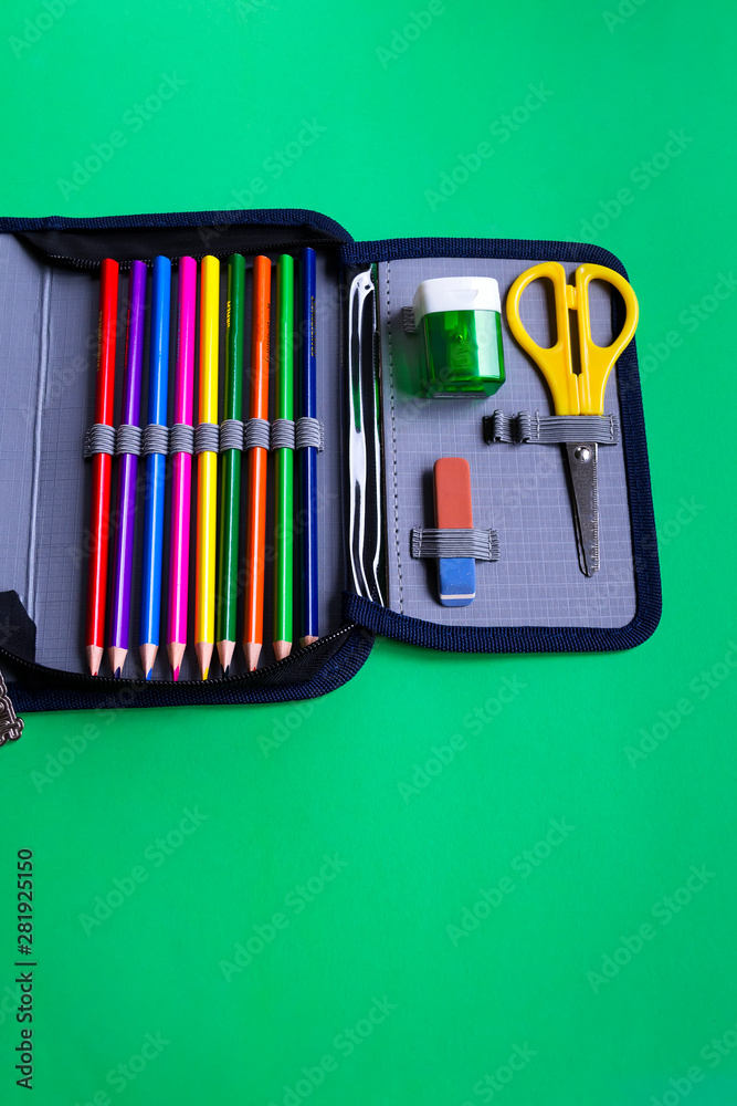 School accessories, eraser, pencils, scissors, sharpener in a pencil case on a paper green background with copy space.