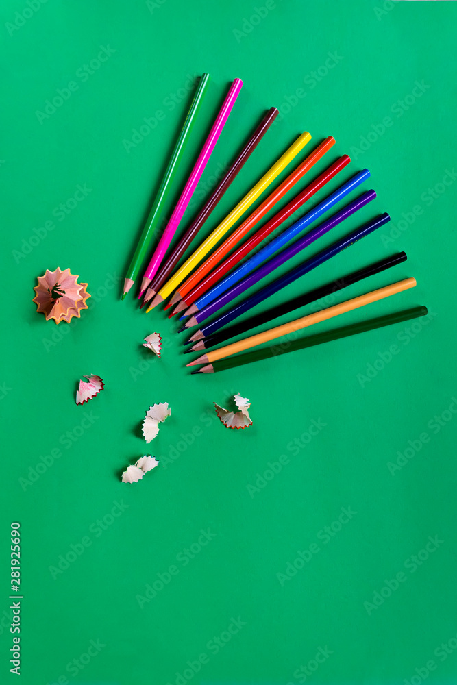 School colored pencils on a paper dark green background.School supplies. Flat lay