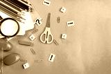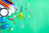 Collection of school accessories on a green paper background with copy space for text. Flat lay