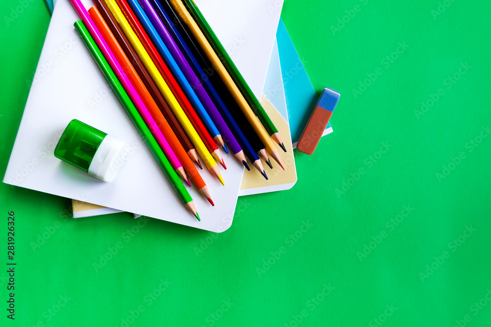 School set of notebooks, pencils, an eraser and sharpeners on a green background with copy space.