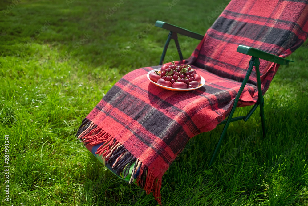 Plate with cherries on a chair in a green summer garden