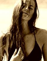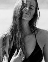 Black and white photo of young beautiful girl posing on a beach with sand in black swimwear. Calm, chilling mood of summer.