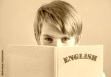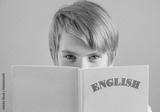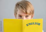 Handsome preteen schoolboy holding yellow english book, modern education, foreign languages
