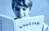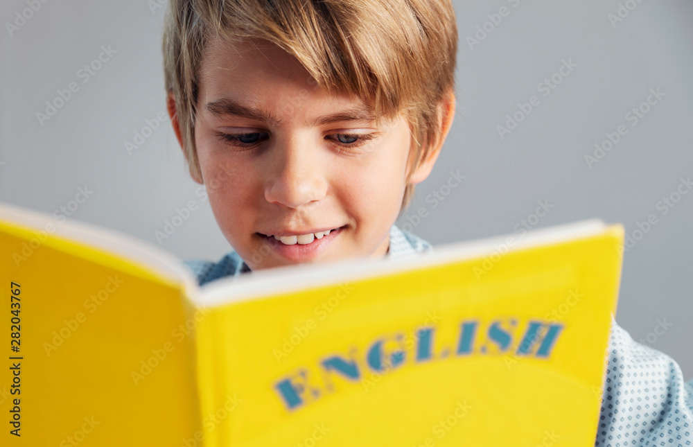 Close up view of blonde handsome preteen schoolboy holding yellow english book