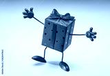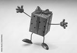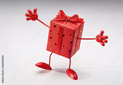 Gift in box. Red box on legs, with handles. Cartoon figure. Copy space.
