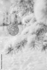Winter nature Christmas background with frozen spruce, glitter, bokeh, snow.