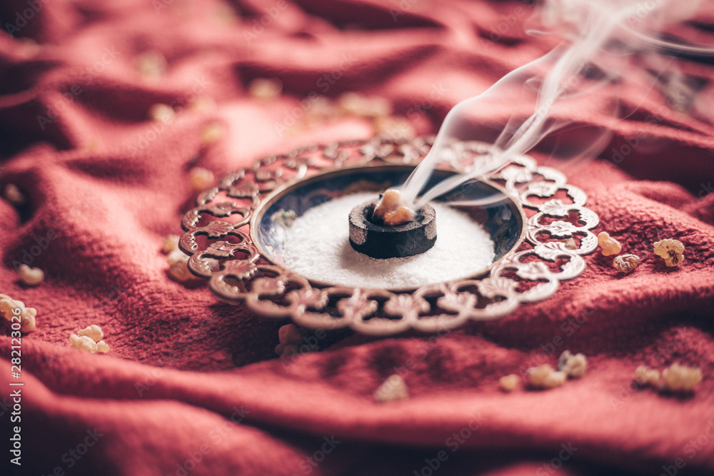 Frankincense burning on a hot coal. Frankincense is an aromatic resin, used for religious rites, incense and perfumes, incense smoke (color toned image)