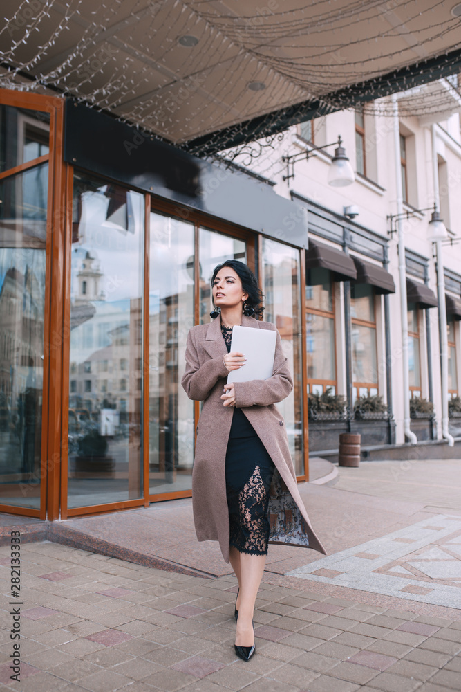 Stylish business woman with laptop in the city street