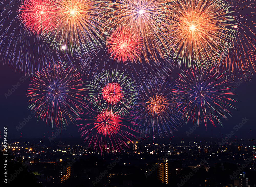 夜の町並みに打ち上がる花火のイメージ