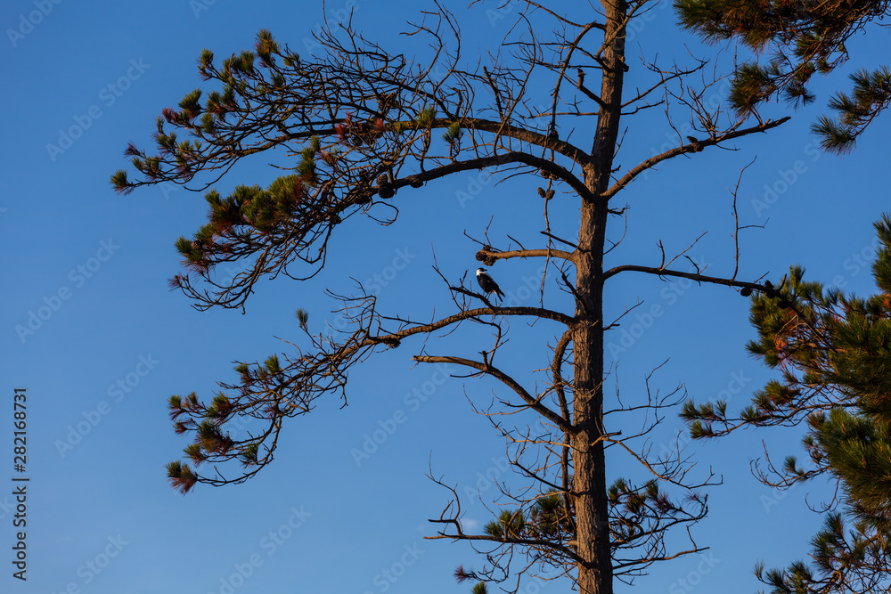 Australian Magpie perching high on a tree branch against blue sky
