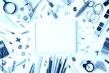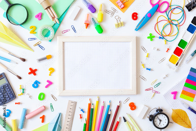 Empty wooden frame with squared paper, alarm clock, different stationery and colorful supplies on white background. Back to school concept. Top view.