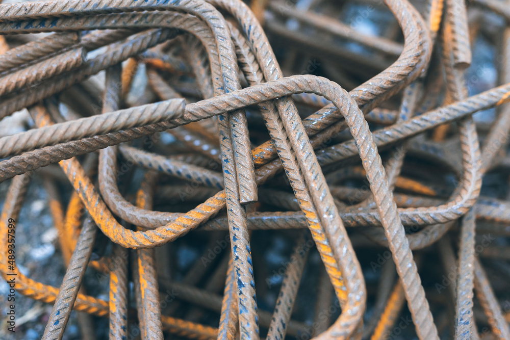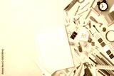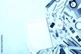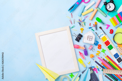 School supplies, stationery and empty frame with squared paper on blue table top view. Education, learning and back to school concept.