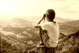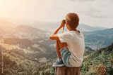 a Boy standing on of stump in summer mountains at sunset and enjoying view of nature