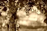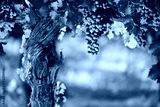 Wine grapes on a beautiful old grapevine with colorful vineyard backlighting and copy space.