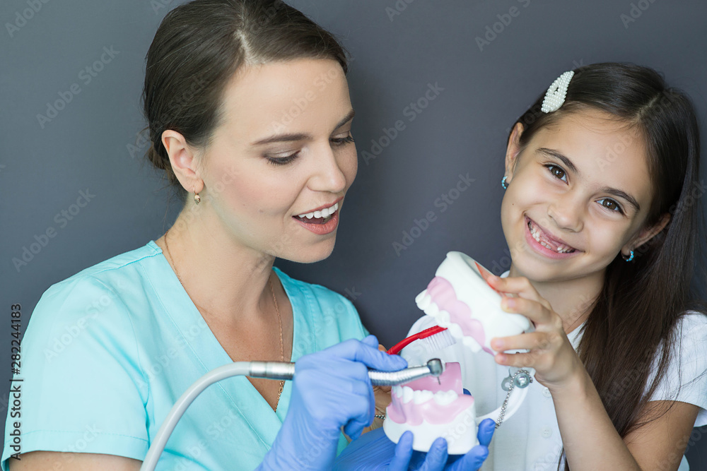 pediatric dentist and mixed race little girl having fun with dental drill and teeth model. Child Teeth treatment