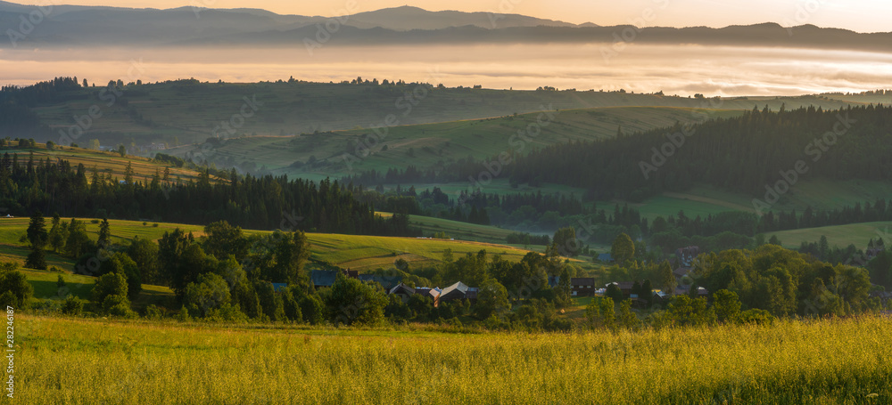 A field of oats on a field in the mountains on a beautiful misty morning