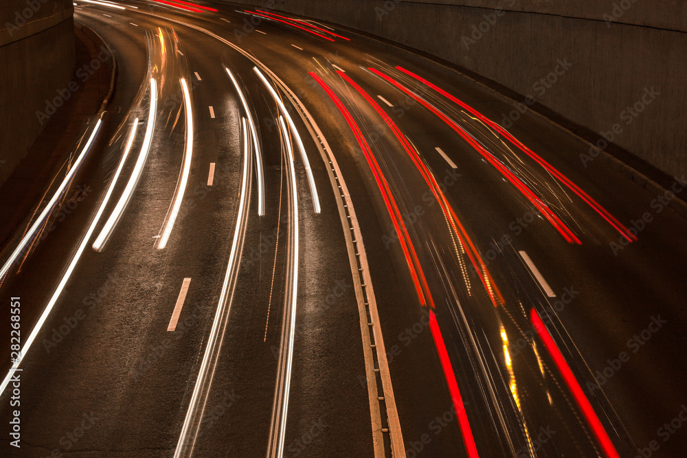 lines of lights on a night road, the movement of cars along the highway in the dark, traces of headlights and stop lights