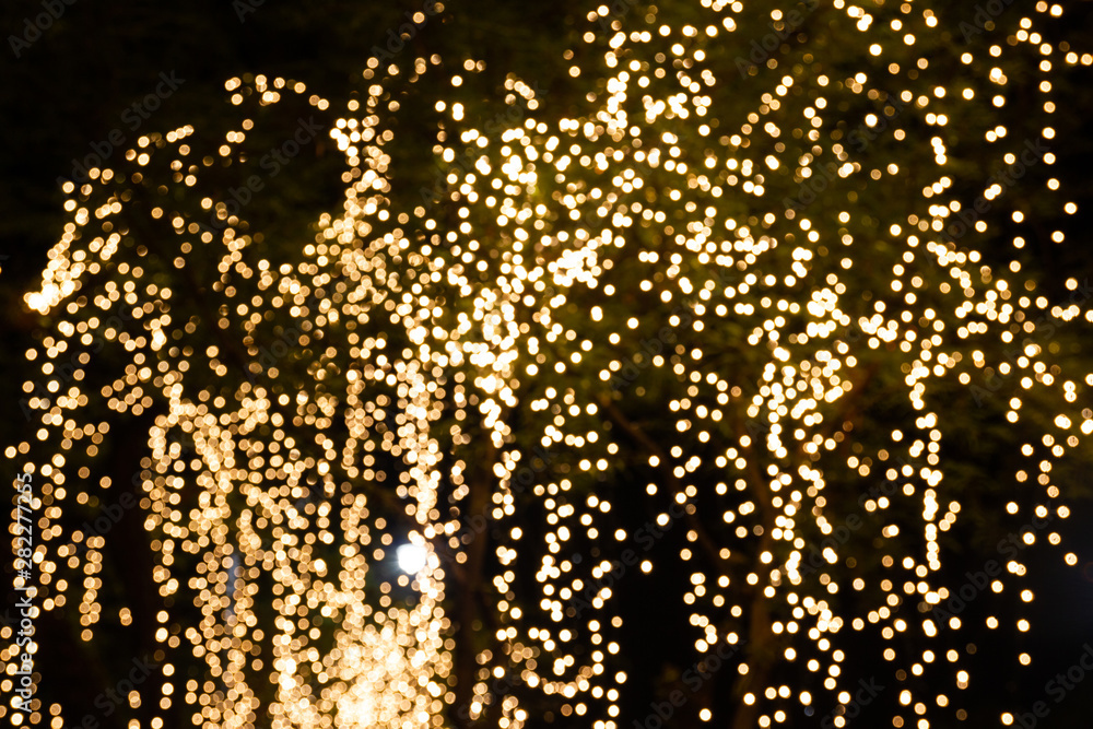 Blur - bokeh Decorative outdoor string lights hanging on tree in the garden at night time