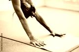 Classical black and white Art Photography of a woman practicing advanced yoga pose indoors on a yoga mat. Woman's dynamic arms in Downward Dog.