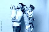 two caring parents standing back to back and holding their children in arms. close up photo. isolated blue background. studio shot.