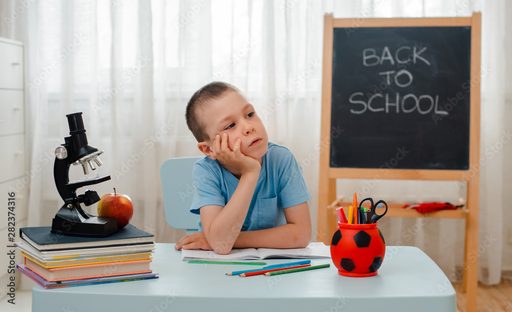 school boy sitting at home classroom lying desk filled with books training material schoolchild sleeping lazy bored