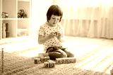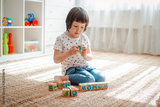 child plays with wooden blocks with letters on the floor in the room a little girl is building a tower at home or in the kindergarten.