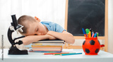 school boy sitting at home classroom lying desk filled with books training material schoolchild sleeping lazy bored
