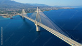 Aerial drone photo of world famous cable suspension bridge of Rio - Antirio Harilaos Trikoupis, crossing Corinthian Gulf, mainland Greece to Peloponnese, Patras