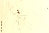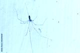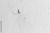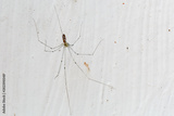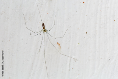 Araña de patas largas con el fondo blanco. Pholcus phalangioides.
