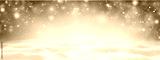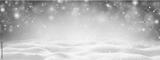Winter snow background with snowdrifts, with beautiful light and snow flakes on the blue sky in the evening, banner format, copy space.