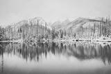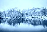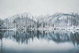 Panoramic view of beautiful winter lake with snowy mountain peaks reflecting in crystal clear mountain lake.