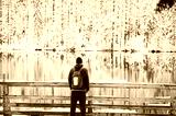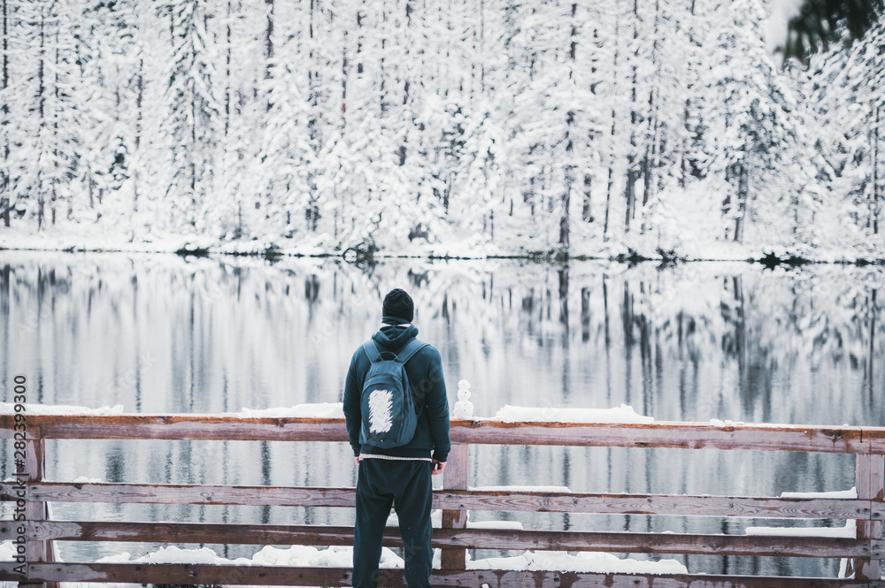 One man traveler stay on the snow mountain lake. Little snowman is near it. Back view.