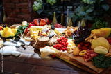 Dish of delicious snacks of cheese, prosciutto, fresh herbs, fruits and berries