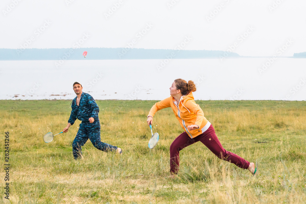 Young couple play badminton on the lake. The girl runs and prepares to beat off a shuttlecock with a racket.