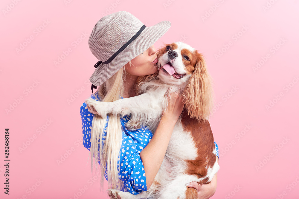 Portrait of smiling young blond woman in summer hat embracing king Charles spaniel dog. owner and pet relations concept. Veterinary health. Isolated front view on pink background.
