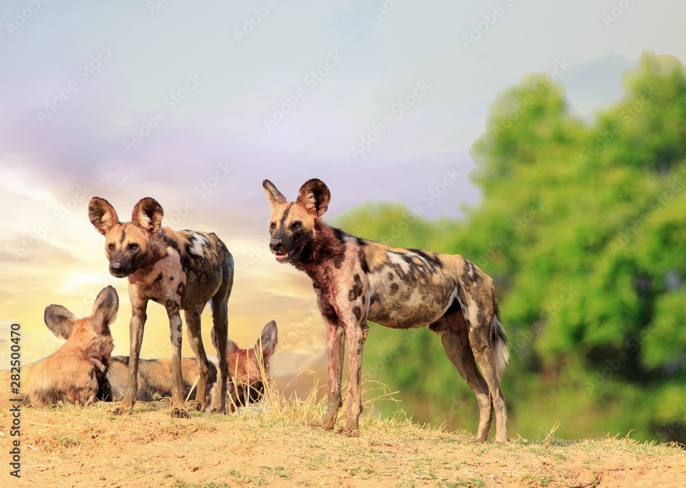 Wild Dogs - Lycaon Pictus - watching and looking alert while standing on a sandbank with a nice pinky sky background in South Luangwa National Park, Zambia, southern africa