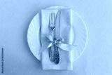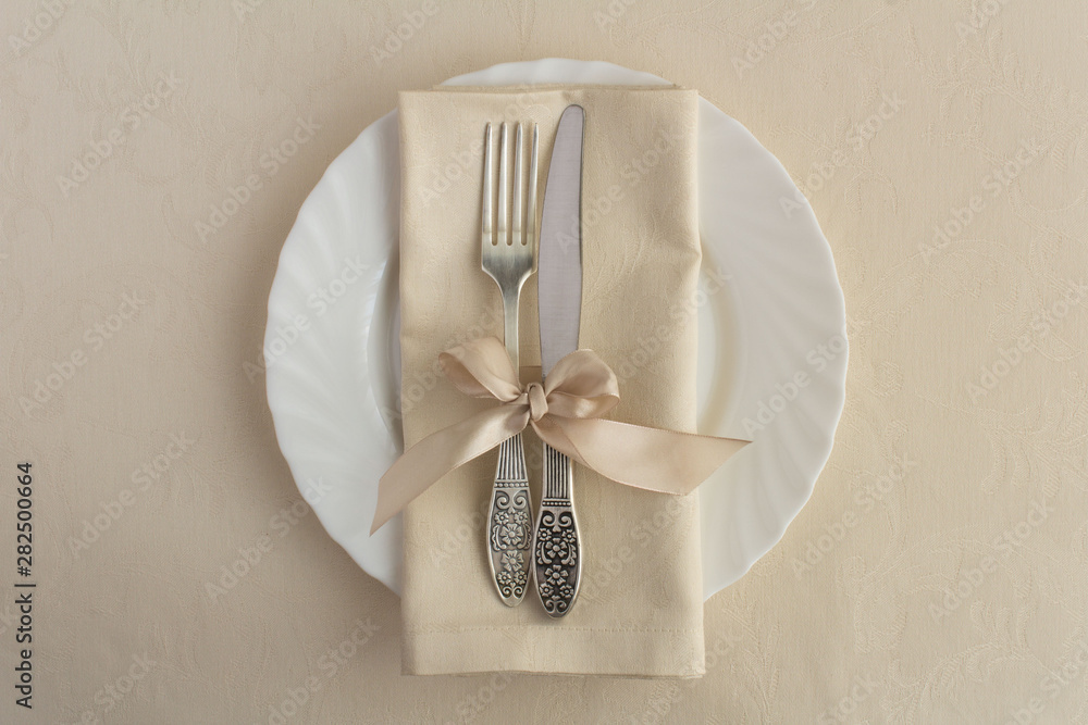 Festive table setting on the white plate on the beige tablecloth. Top view. Copy space.