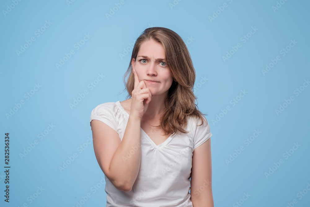 young woman looks with doubt wears white t shirt, trying to make right decision