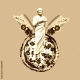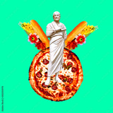 Contemporary art collage. Sculpture renaissance Man and favorite fast food