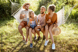Portrait of a group of cheerful friends sitting together on the hammock, having fun outdoors during a summer days