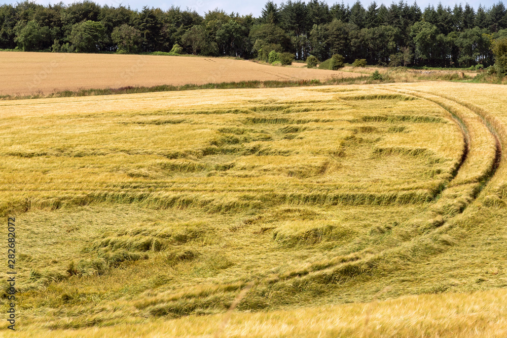 Cheltenham, Gloucestershire, England, UK. July 2019. Storm damaged crops in a farmers field much of the crop is laying flat after strong winds and lightening.
