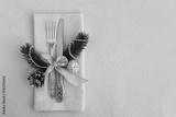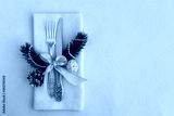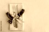 Christmas table setting on the beige tablecloth. Top view. Copy space.