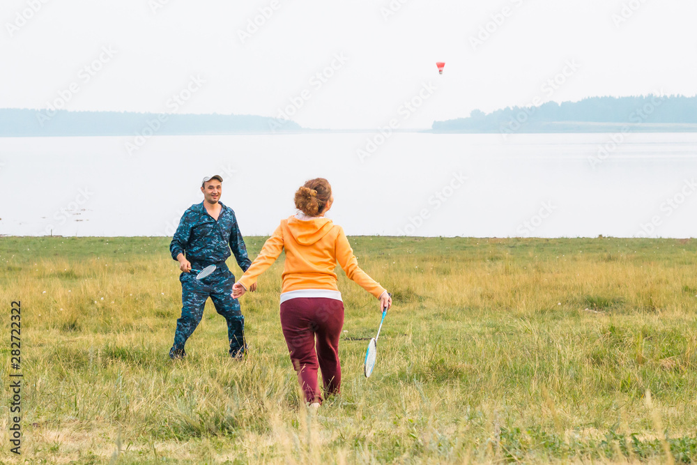 Young couple play badminton on the lake. The guy gave the pitch. The girl is preparing to hit the shuttlecock with a racket.