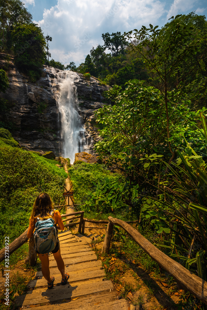 Tourist walks down wooden stairs at Wachirathan waterfall in Doi Inthanon National Park near Chiang Mai Thailand