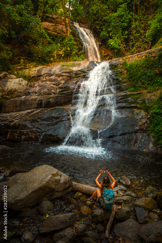 Backpacker taking pictures with smartphone Huai Sai Luang waterfall in Doi Inthanon National Park near Chiang Mai Thailand