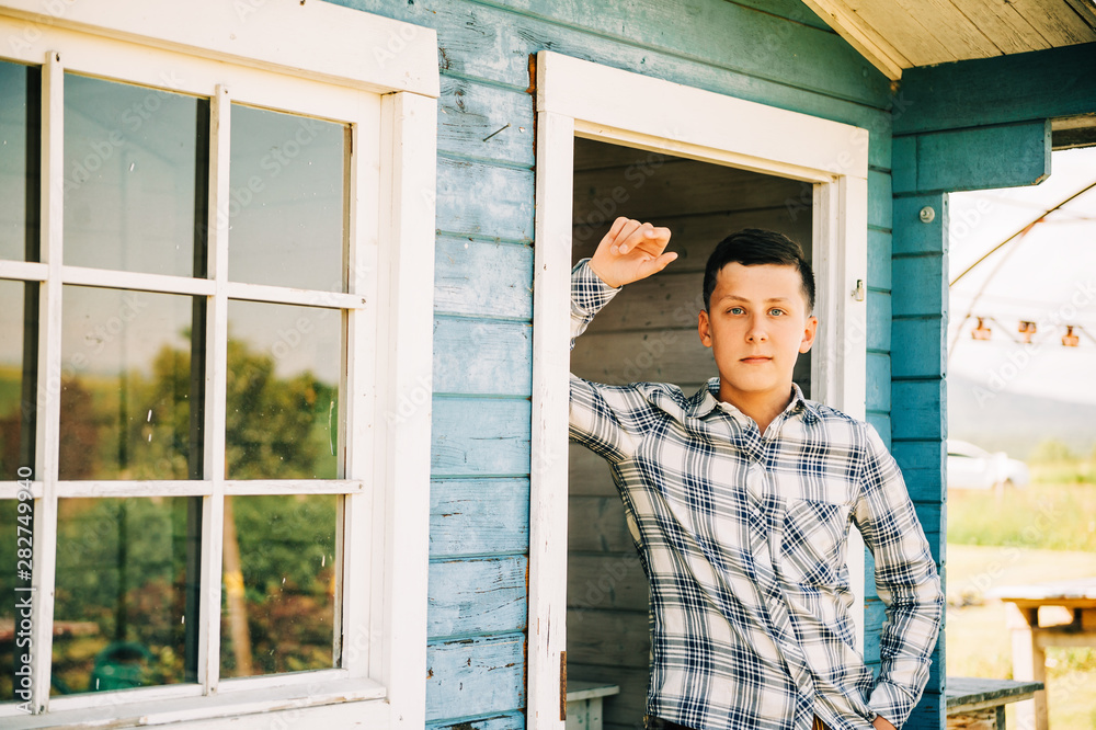Outdoor portrait of handsome teenage boy wearing blue plaid shirt, leaning on the wall