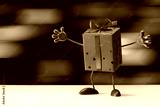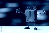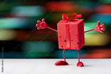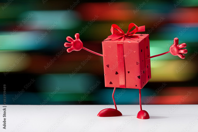 Merry gift in red box with legs and hands. Unexpected congratulations. Copy space, bright background.