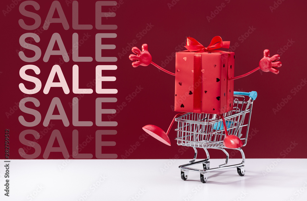 Festive red box with legs and hands in shopping cart. Discounts, sale.