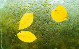 Yellow autumn leaves stuck to the wet window. The glass in drops of rain.
