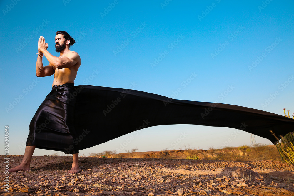 Long hair Asian Young handsome muscled fit male model man posing outdoor showing his muscles cloth flying in air fantasy style - Image